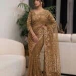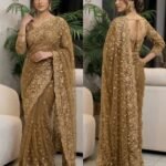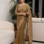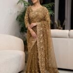 This sophisticated ensemble perfectly balances traditional opulence with contemporary grace. Crafted from a delicate, high-quality net fabric in a rich, warm bronze-gold hue, the saree offers a lightweight, airy drape that flows beautifully.