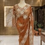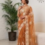This sophisticated ensemble perfectly balances traditional opulence with contemporary grace. Crafted from a delicate, high-quality net fabric in a rich, warm bronze-gold hue, the saree offers a lightweight, airy drape that flows beautifully.