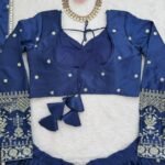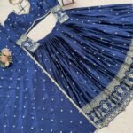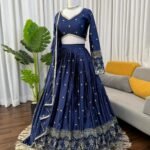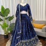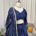This regal navy blue lehenga set is a masterclass in understated luxury, combining a deep jewel-toned palette with shimmering silver accents. It’s a versatile ensemble that transitions perfectly from a high-glam wedding to a sophisticated festive celebration.