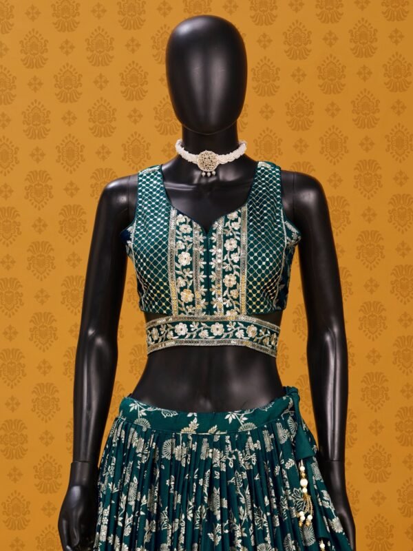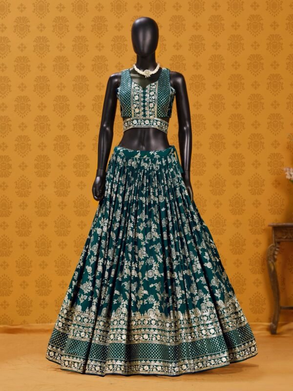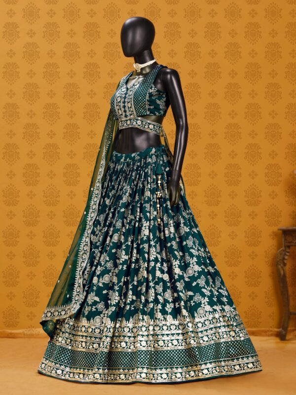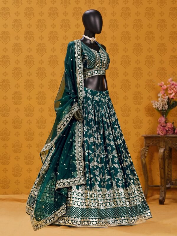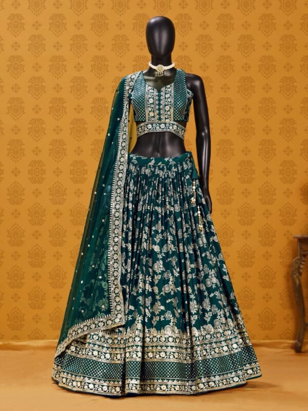 Command the room in this breathtaking Emerald Green Lehenga, a masterpiece of traditional craftsmanship blended with contemporary flair. Designed for the modern woman who cherishes heritage, this ensemble is an exquisite choice for weddings, receptions, or high-glamour festive events.